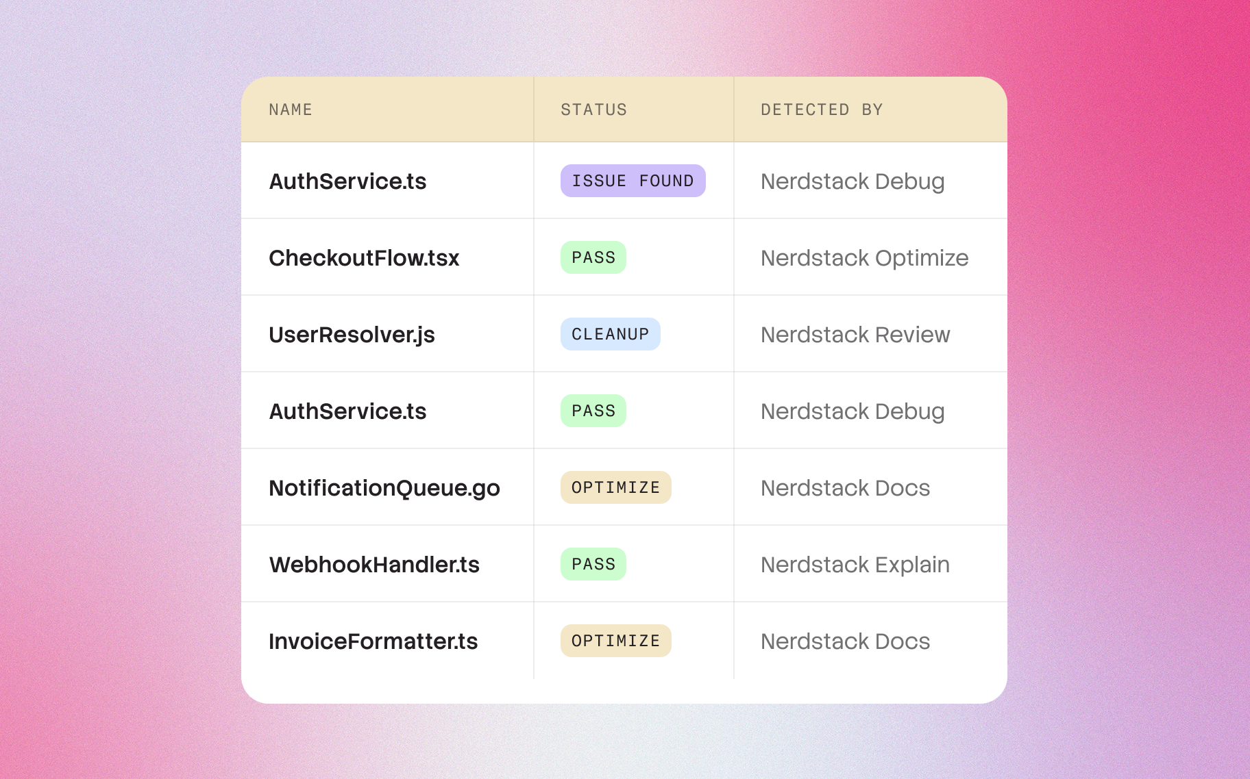 Nerdstack dynamically understands how a function interacts with external systems, state, and dependencies. It maps out the control flow, identifies side effects, and extracts behavior across different execution paths. Unlike static analysis tools that often stop at type information, Nerdstack interprets intent — why a function exists, not just what it does syntactically. That difference is what turns explanations from technical summaries into something humans can actually rely on when making decisions.